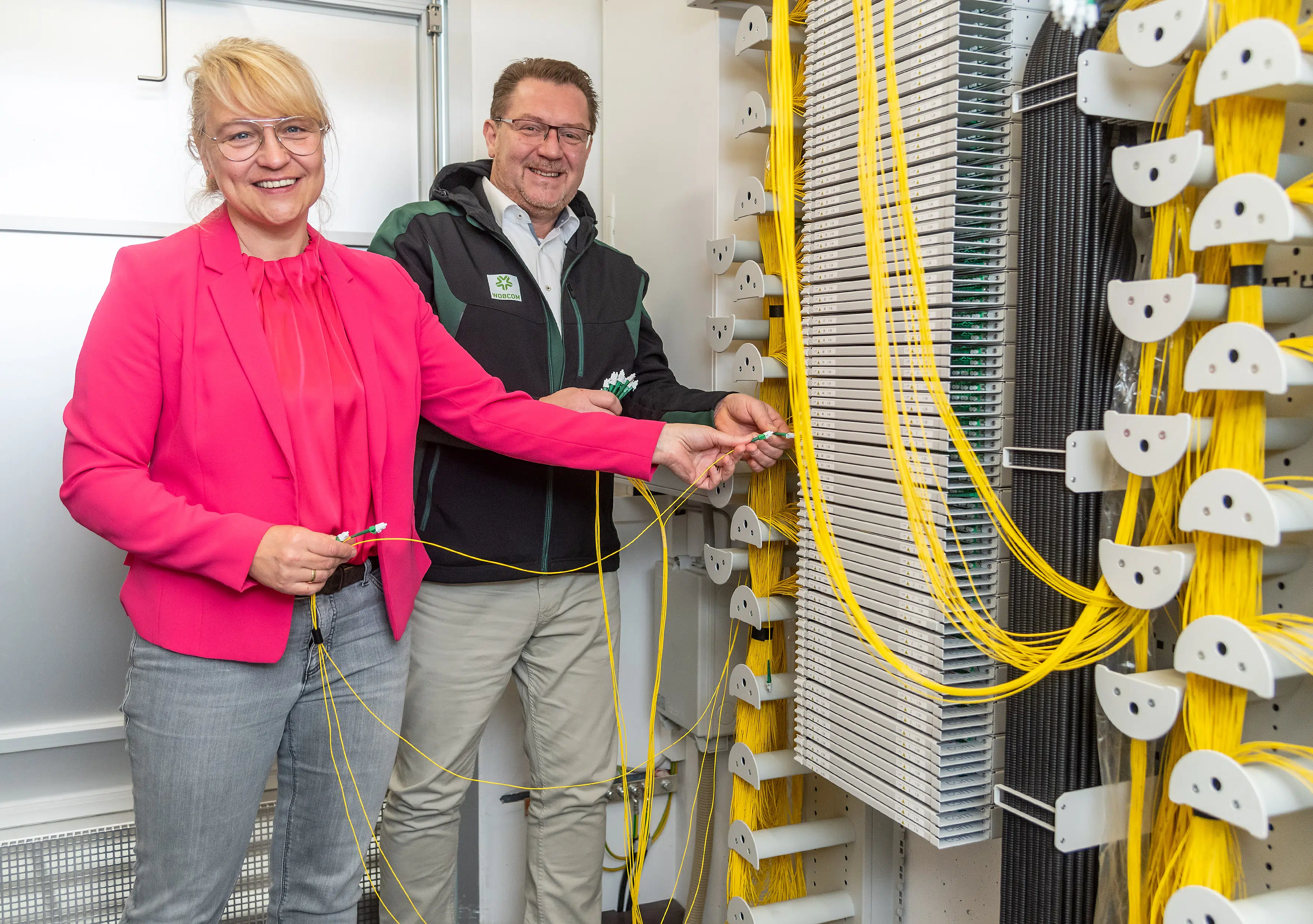 Die Stadtwerke Wolfsburg AG und die WOBCOM GmbH haben die Breitbandversorgung im Wolfsburger Ausbaugebiet Vorsfelde-Nord erfolgreich abgeschlossen. Ortsbürgermeisterin Sandra Straube aktivierte gemeinsam mit Thomas Schulz, Leiter Vertrieb und Kundenservice der WOBCOM, im Technik-Gebäude (PoP) am Schützenplatz in Vorsfelde symbolisch den letzten Anschluss. Damit verfügen alle Haushalte, die einen Glasfaser basierten Anschluss beauftragt haben, nun über eine zukunftsfähige, schnelle Internetverbindung.