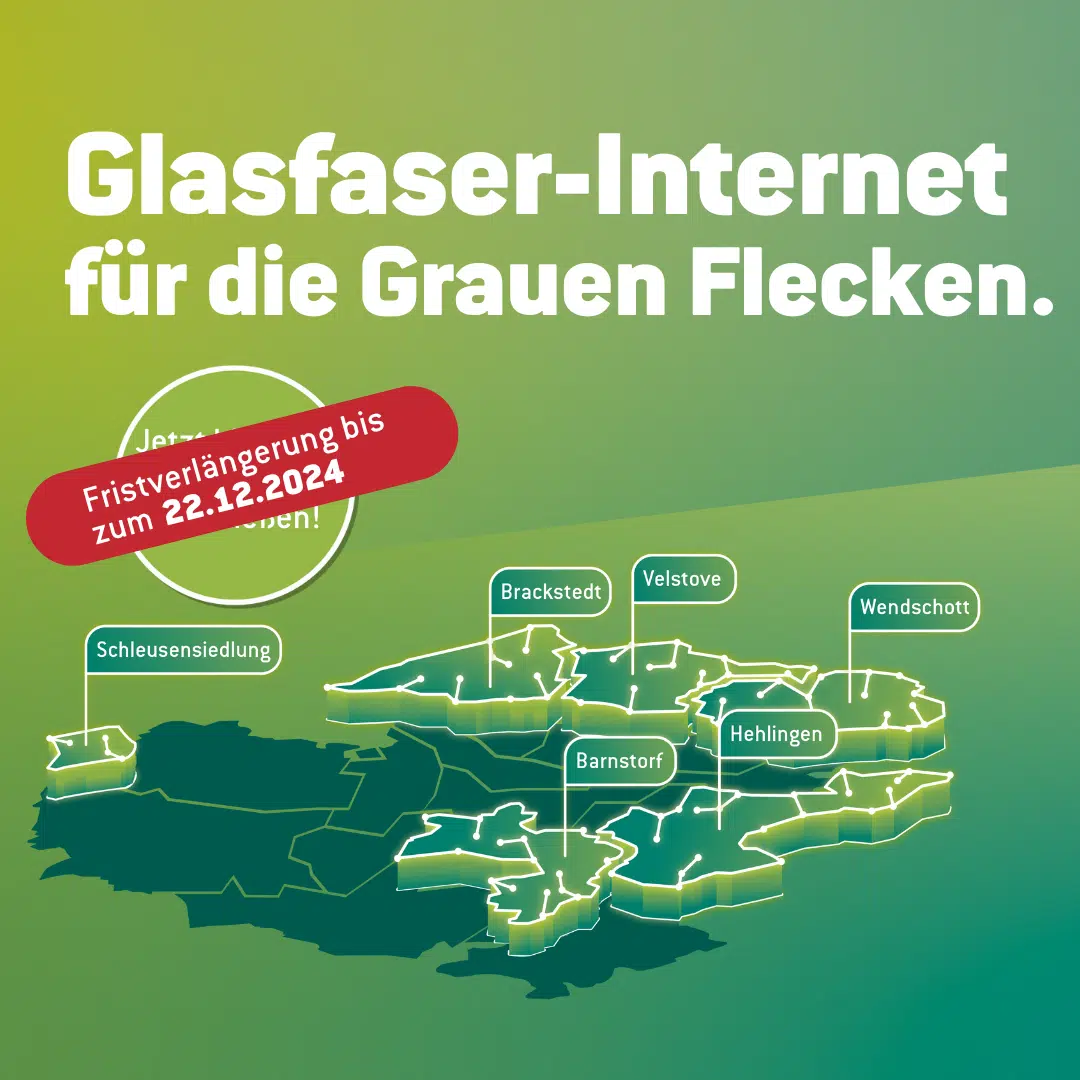 Wer in der Weihnachtszeit nicht nur andere, sondern auch sich selbst beschenken möchte, hat nun die Gelegenheit: Die Frist für die Bewohnenden der Ortschaften Wendschott, Hehlingen, Velstove, Brackstedt, Barnstorf und der Schleusensiedlung für einen kostenlosen Glasfaseranschluss wird auf den 22. Dezember 2024 verlängert.