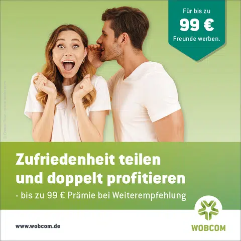 Hinweise: Der geworbene Festnetz-Neukunde (Glasfaser / DSL) darf zwölf Monate vor Vertragsschluss kein WOBCOM-Kunde gewesen sein oder in einem Haushalt mit dem Bestandskunden leben. Die Gutschrift richtet sich nach dem vom Neukunden abgeschlossenen Tarif (ohne Zusatzoptionen) und erfolgt über die WOBCOM-Rechnung einmalig für den Bestandskunden automatisch nach Anschlussaktivierung beim Neukunden. Eine Barauszahlung ist nicht möglich. WOBCOM-Mitarbeiter*innen und deren Angehörige sind von dieser Aktion ausgeschlossen. Aktion gilt für Privatkund*innen bis auf Widerruf.