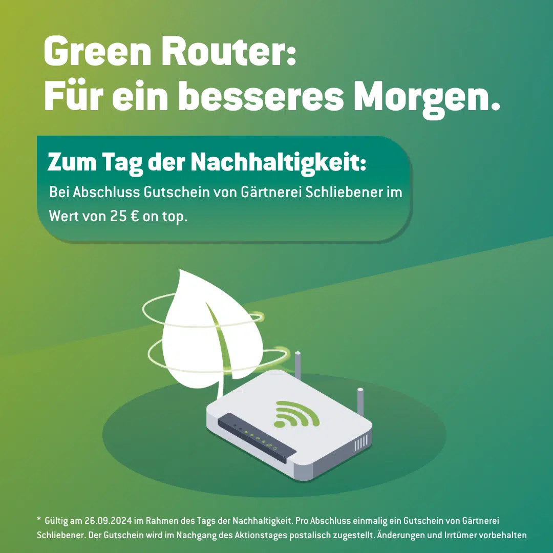 Bei Abschluss eines Glasfaservertrags im WOBCOM-Kundencenter mit einem Green Router einen 25 €-Gutschein von der Gärtnerei Schliebener sichern.