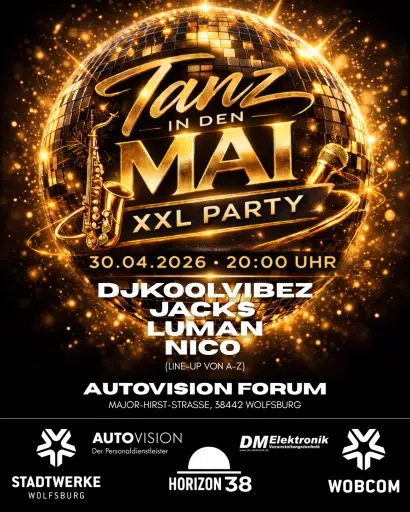 Wir sind dabei: Am 30. April 2026 wird das AutoVision Forum in Wolfsburg zur angesagten Partylocation: Bei der „Tanz in den Mai XXL“-Party erwarten dich ab 20:00 Uhr eine unvergesslicher Abend voller Beats, Tanz und besonderer Atmosphäre. Freu dich auf Live-Musik und DJs mit einem Mix aus House, Charts und Pop.