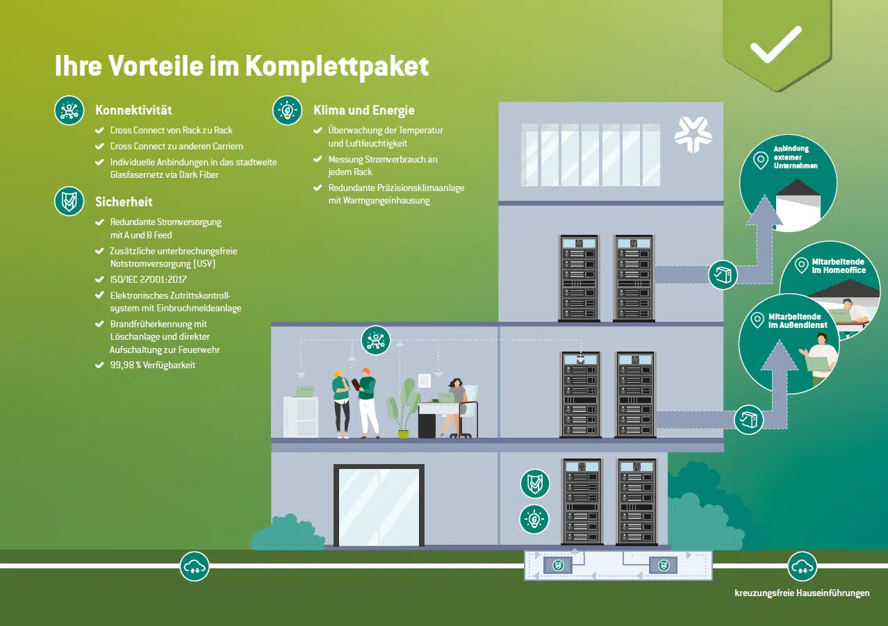 Im Herzen der Stadt Wolfsburg übernimmt das Rechenzentrum nicht nur die Funktion als lokaler Internet-Knotenpunkt der Region, sondern ist zudem an weitere Internet-Knoten auf der ganzen Welt angebunden. Es bietet Rundum-Lösungen für IT- und Serversysteme, Cloud-Lösungen, Hosting- sowie Colocation-Dienste. Durch WAN-Optimierung werden der Datenfluss über dieses Wide Area Network zwischen Rechenzentrum und entfernten Standorten verbessert, Kapazitätsbeschränkungen reduziert und, wenn erforderlich, höhere Bandbreiten bereitgestellt, mit denen Endnutzer auf Anwendungen und Informationen jederzeit ohne Datenverlust zugreifen können. Im gesamten Stadtgebiet wurden durch den Einsatz der Glasfaser-Technologie zahlreiche kleinere Edge-Rechenzentren geschaffen, die z.B. für die schnelle Datenverarbeitung bei 5G-Mobilfunkübertragungen oder auch insbesondere beim autonomen Fahren notwendig sind.