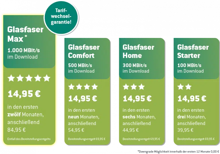 Innerhalb des ersten Vertragsjahres kannst du kostenfrei in einen Tarif mit geringerer Bandbreite wechseln, ohne dass sich die Vertragslaufzeit verlängert.