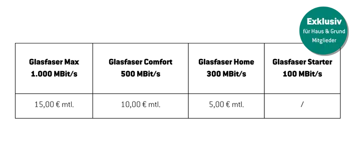 *Bei Abschluss eines Glasfaser-Tarifs der WOBCOM GmbH mit einer Vertragslaufzeit von 24 Monaten erhalten Mitglieder des Vereins Haus & Grund Wolfsburg und Umgebung e. V. bzw. deren Mieter exklusiv einen Rabatt auf den monatlichen Basistarifpreis in den ersten 24 Monaten der Vertragslaufzeit bei Verwendung des Aktionscodes HUG. Der Rabatt ist abhängig vom gewählten Tarif: Abschluss Glasfaser: Glasfaser Max (1.000 Mbit/s) – 15,00 € Rabatt mtl. / Glasfaser Comfort (500 Mbi/s) – 10,00 € Rabatt mtl. / Glasfaser Home (300 Mbit/s) – 5,00 € Rabatt mtl. Tarifangebot je nach Verfügbarkeit. Änderungen und Irrtümer vorbehalten. Nicht mit anderen Aktionen kombinierbar. Aktion auch nutzbar durch Mieter:innen bei Verwendung des Aktionscodes. Weitere Informationen zu den Tarifen unter www.wobcom.de. Gültig bis auf Widerruf.