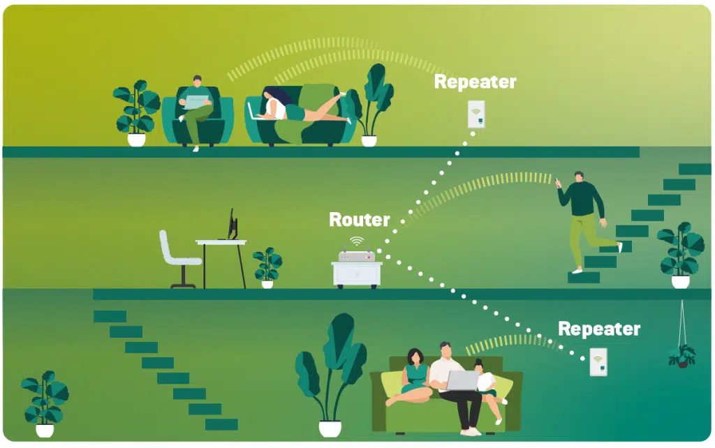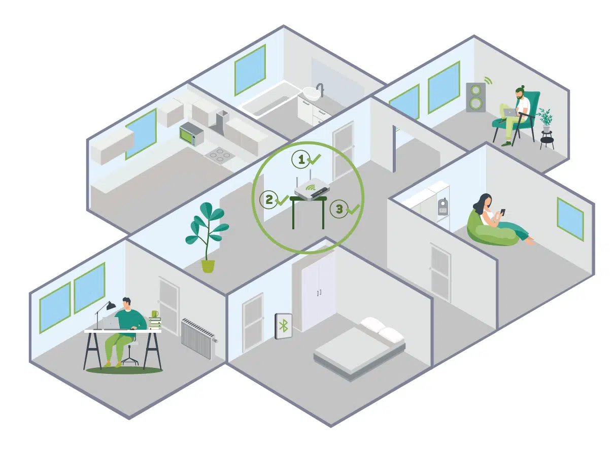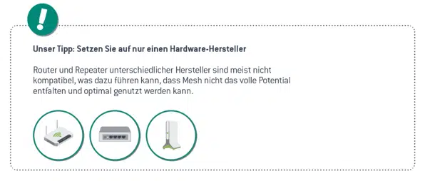 Sollten Sie eine größere Fläche in Ihrem Zuhause mit WLAN versorgen wollen, achten Sie darauf, dass sowohl Ihr Router, als auch Ihre Repeater die Mesh-Funktion unterstützen. Mesh sorgt für ein hausinternes Roaming und verbindet ihre WLAN Geräte optimal und vollautomatisch. Bewegen Sie sich so ohne Abbrüche durch Ihr Zuhause.