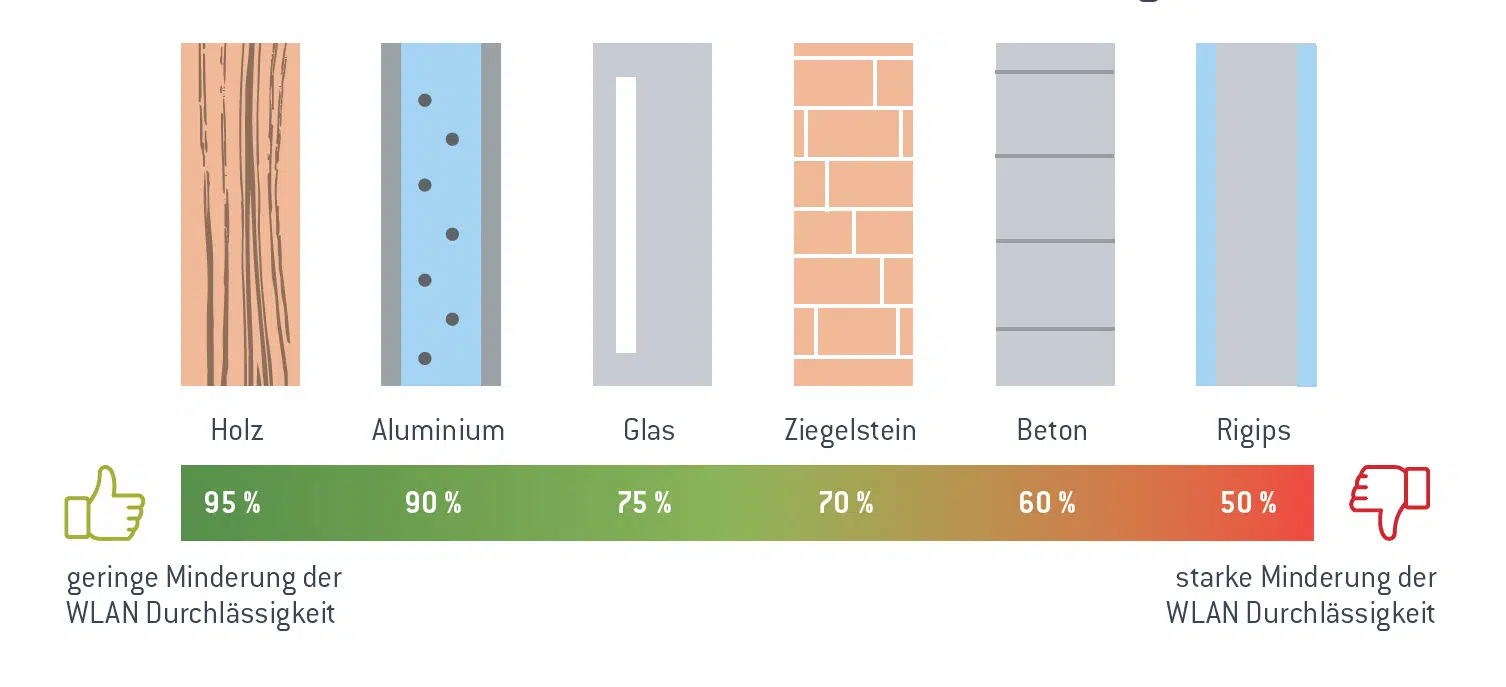 Unterschiedliche Baustoffe haben einen unterschiedlichen Einfluss auf die WLAN-Durchlässigkeit.