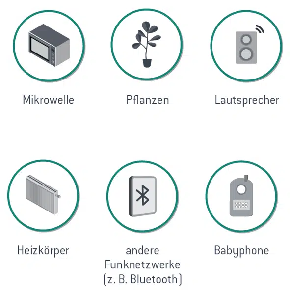 Insbesondere andere elektronische Geräte, wie Bluetoothgeräte, Mikrowellen, Lautsprecher oder ein Babyphone können einen Einfluss auf das WLAN-Signal haben, da diese Geräte selbst eine gewisse Strahlung abgeben.