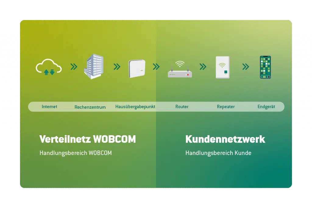 Der erste Teilbereich ist das Verteilnetz der WOBCOM, welches bis zu Ihrem Hausanschluss reicht und bei Ihrem Router endet. Die Internetgeschwindigkeit ist in Ihrem Vertrag geregelt.
