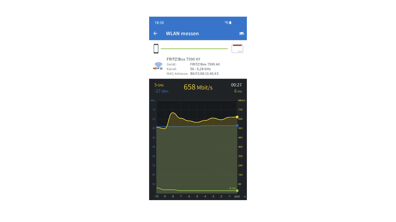 Mit einem Smartphone können Sie mit Hilfe von WLAN-Apps, z. B. der FRITZ!WLAN App von AVM (für iOS und Android), eine WLAN-Messung in Echtzeit durchführen. Das funktioniert auch in Kombination mit anderen Hardware-Herstellern. Dabei wird die Bandbreite vom Smartphone zum Router bzw. Repeater gemessen. Der Vorteil hier ist es, die Angabe der durchschnittlichen, maximalen und minimalen Durchsatz-Rate (also die Netto-Werte) zu bekommen. Wenn Sie sich während der Messung langsam in der Wohnung bewegen, bekommen Sie einen Überblick des verfügbaren WLAN Signals in Ihrem gesamten Wohnraum.