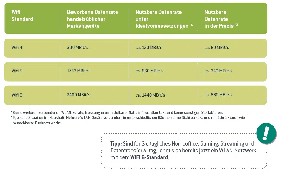 Generell sollten Ihre Geräte für die WLAN-Infrastruktur (Router, Repeater) mindestens dem WiFi 5-Standard (das heißt dem WiFi-Standard der 5. Generation, erkennbar durch Bezeichnung „AC“ am Gerät) entsprechen. Die Übertragungsraten von noch älteren WiFi-Standards (wie WiFi4, erkennbar durch Bezeichnung „n“ am Gerät) reichen bei den meisten WOBCOM-Tarifen schon nicht mehr aus, um eine optimale Leistung zu erbringen.